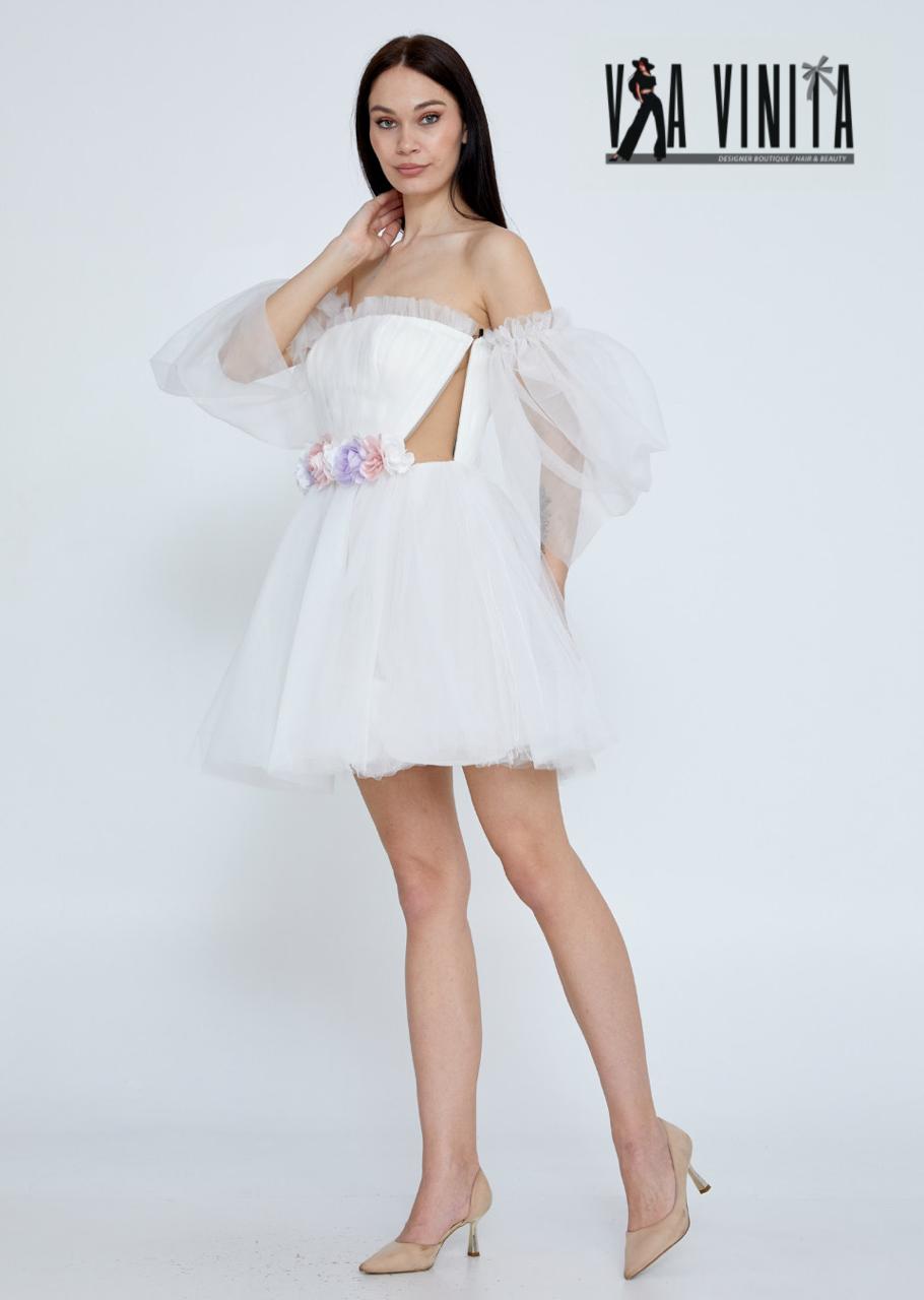 Step into a dream with this beautiful white tulle mini dress. This dress features a soft, off-the-shoulder design with delicate, voluminous puff sleeves that create a whimsical and romantic silhouette. A thin, ruched band cinches the waist, which is adorned with subtle floral appliqués in soft pastel tones of pink, lilac, and white. The full tulle skirt adds a playful, fairytale-like quality, making it the perfect choice for a special occasion like a bridal shower, engagement party, or birthday celebration.