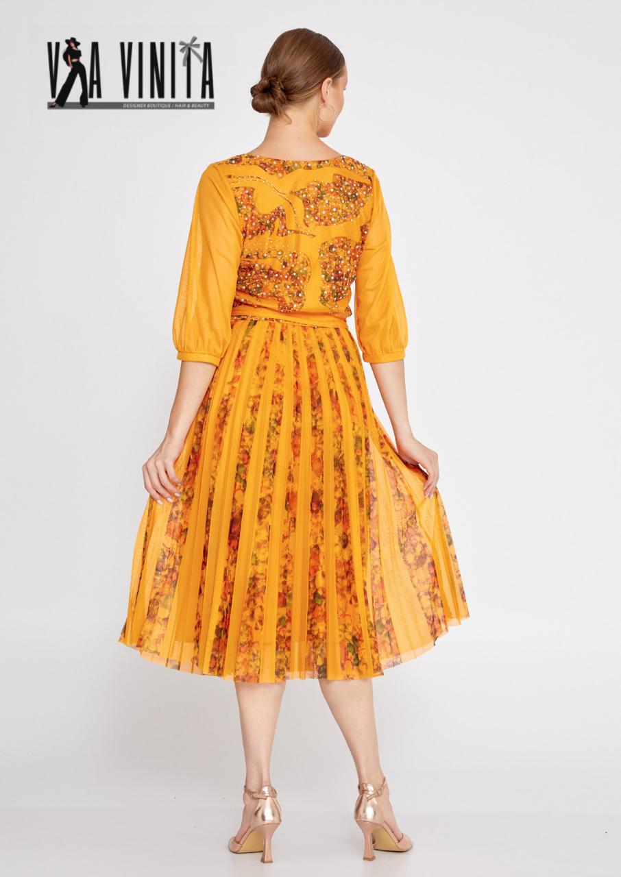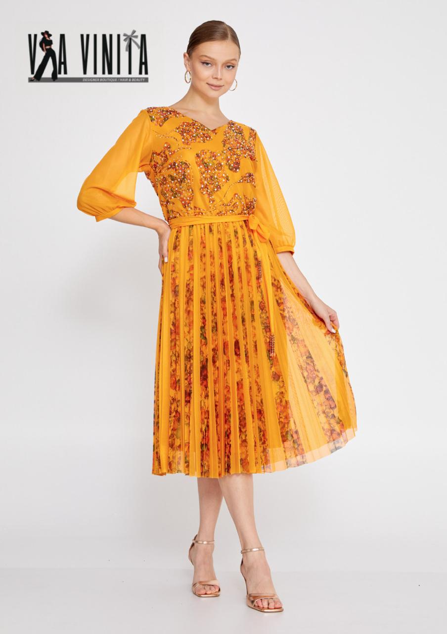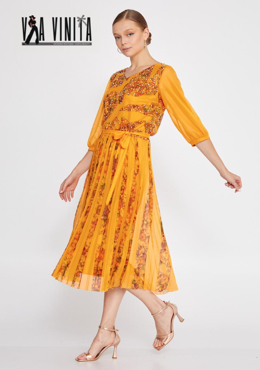 Sophisticated and vibrant, this stunning dress features a beautiful golden marigold hue with a detailed floral print. The fitted, embellished bodice is adorned with intricate beads and sequins that catch the light, adding a touch of sparkle. The sheer, three-quarter length sleeves and a coordinating waist tie complete the elegant and flattering silhouette. The flowing pleated midi skirt creates graceful movement with every step, making this an ideal choice for special events.