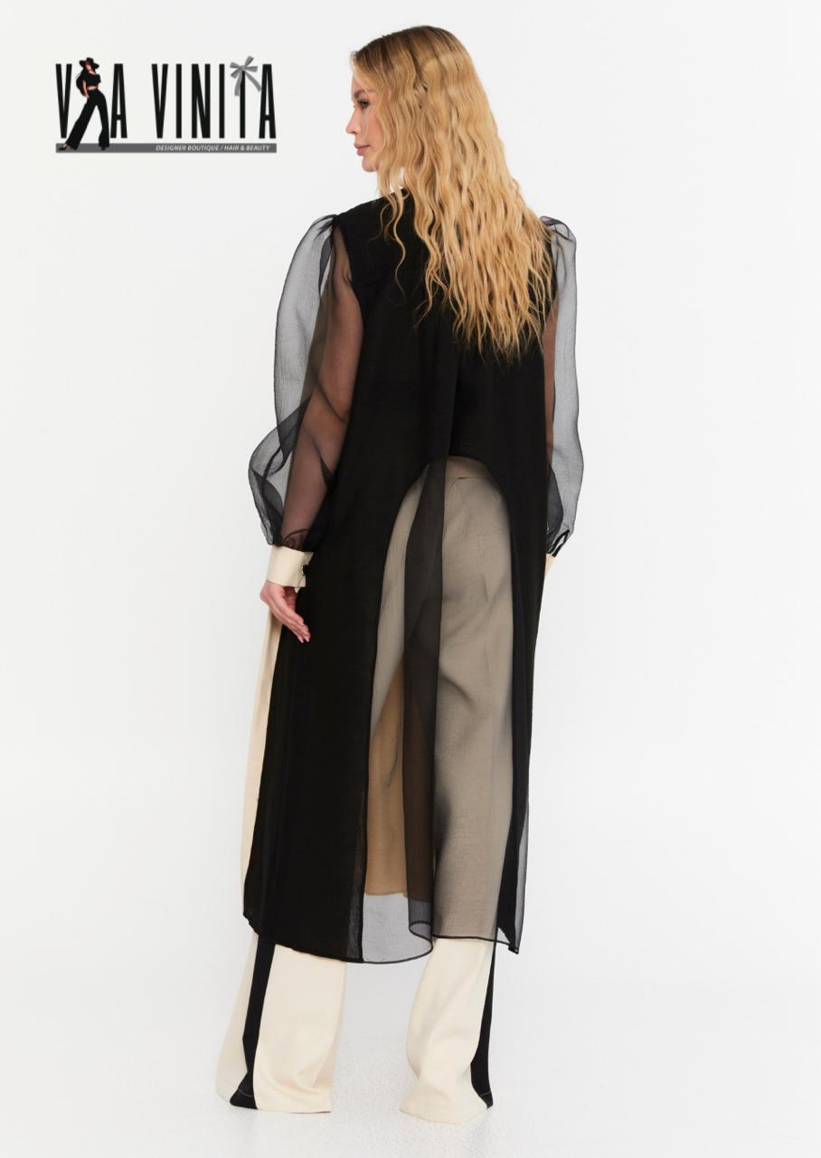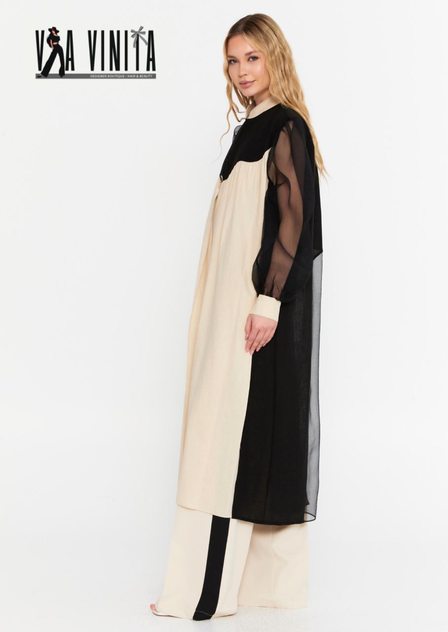 Sophisticated and modern, this flowing two-tone ensemble pairs a soft sand-toned tunic with sheer black bishop sleeves and a contrasting black yoke for a striking yet refined effect. The loose, draped silhouette offers effortless movement and comfort, while side slits add a contemporary edge. Styled with matching wide-leg trousers, this look is perfect for chic daytime events or elevated evening outings.