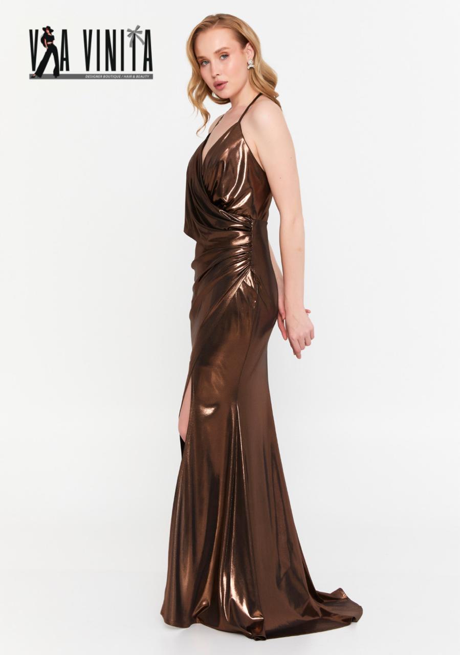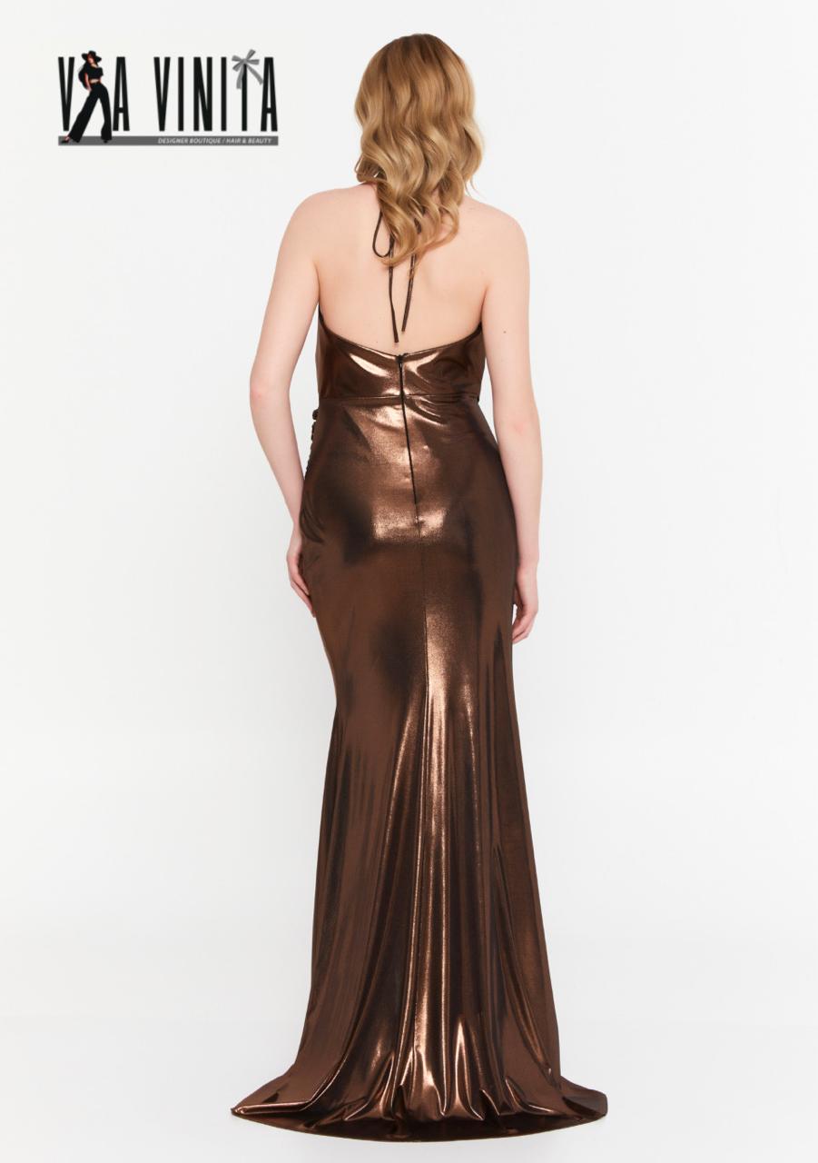 Striking and glamorous, this exquisite bronze halter gown is designed to turn heads. Crafted from a lustrous, shimmering fabric, the dress features a flattering draped bodice that creates an elegant V-neckline. The fitted silhouette gracefully flows into a full-length skirt, highlighted by a daring high slit that adds a touch of allure and allows for confident movement. Perfect for evening galas, formal events, or a sophisticated night out, this gown embodies modern elegance with a captivating sparkle.