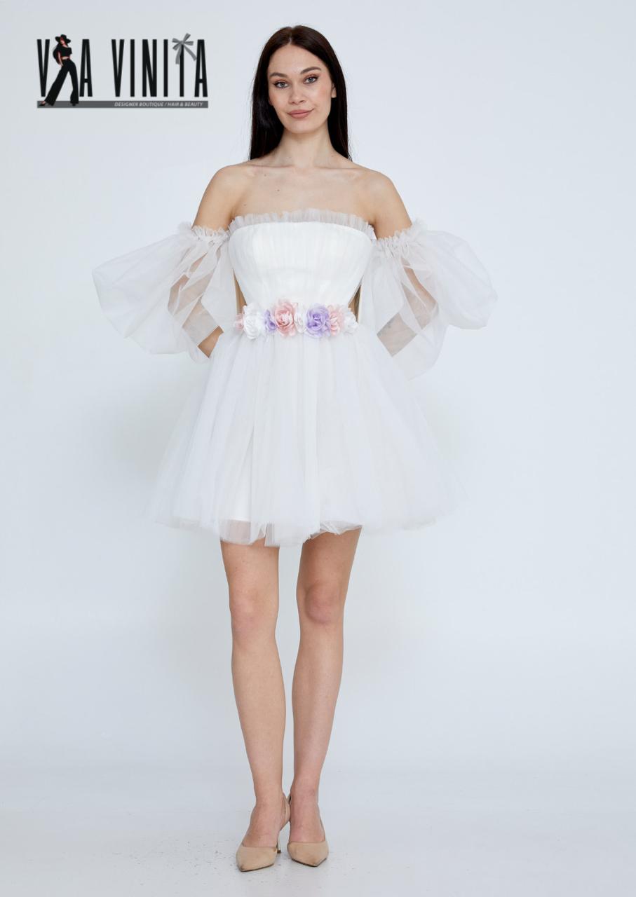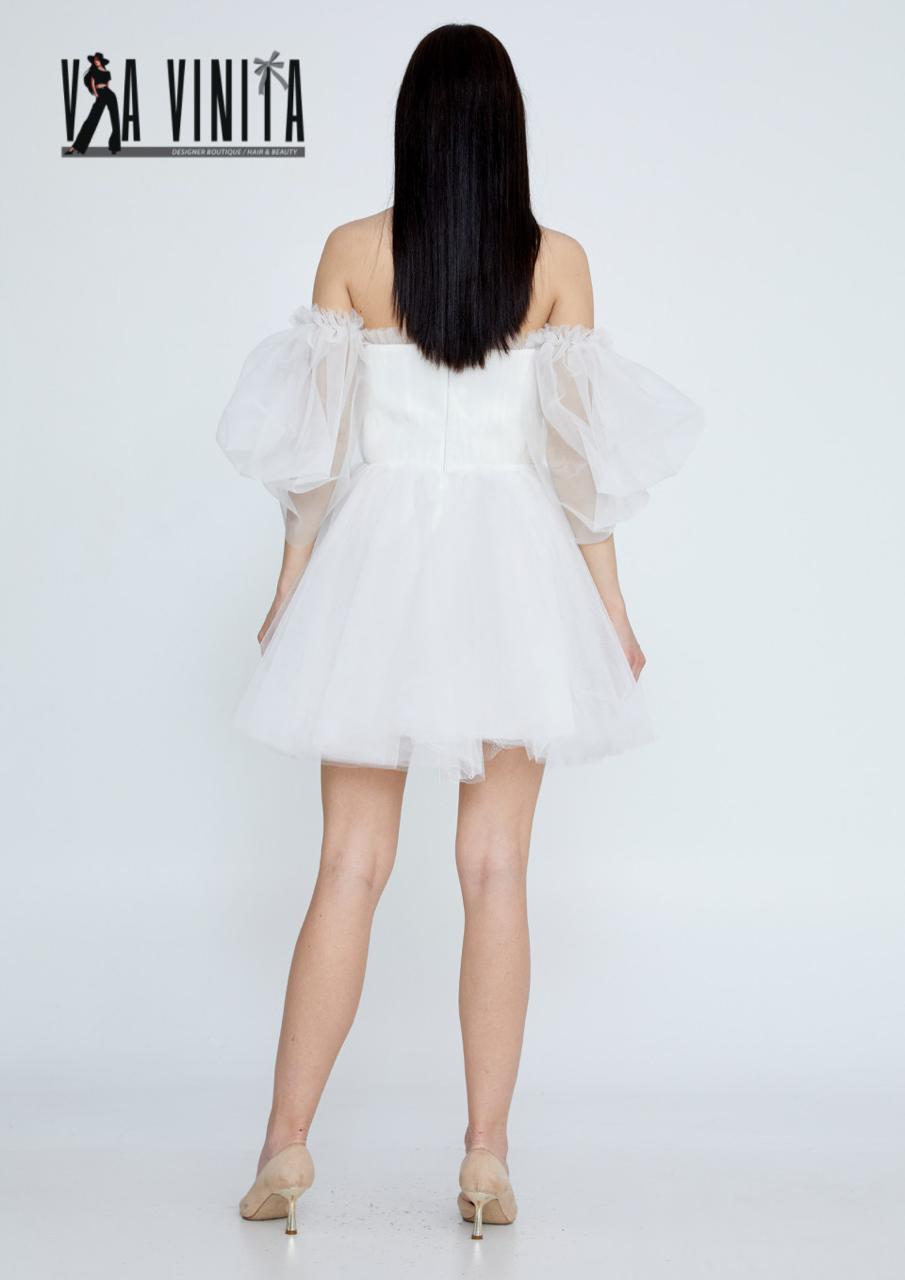 Step into a dream with this beautiful white tulle mini dress. This dress features a soft, off-the-shoulder design with delicate, voluminous puff sleeves that create a whimsical and romantic silhouette. A thin, ruched band cinches the waist, which is adorned with subtle floral appliqués in soft pastel tones of pink, lilac, and white. The full tulle skirt adds a playful, fairytale-like quality, making it the perfect choice for a special occasion like a bridal shower, engagement party, or birthday celebration.