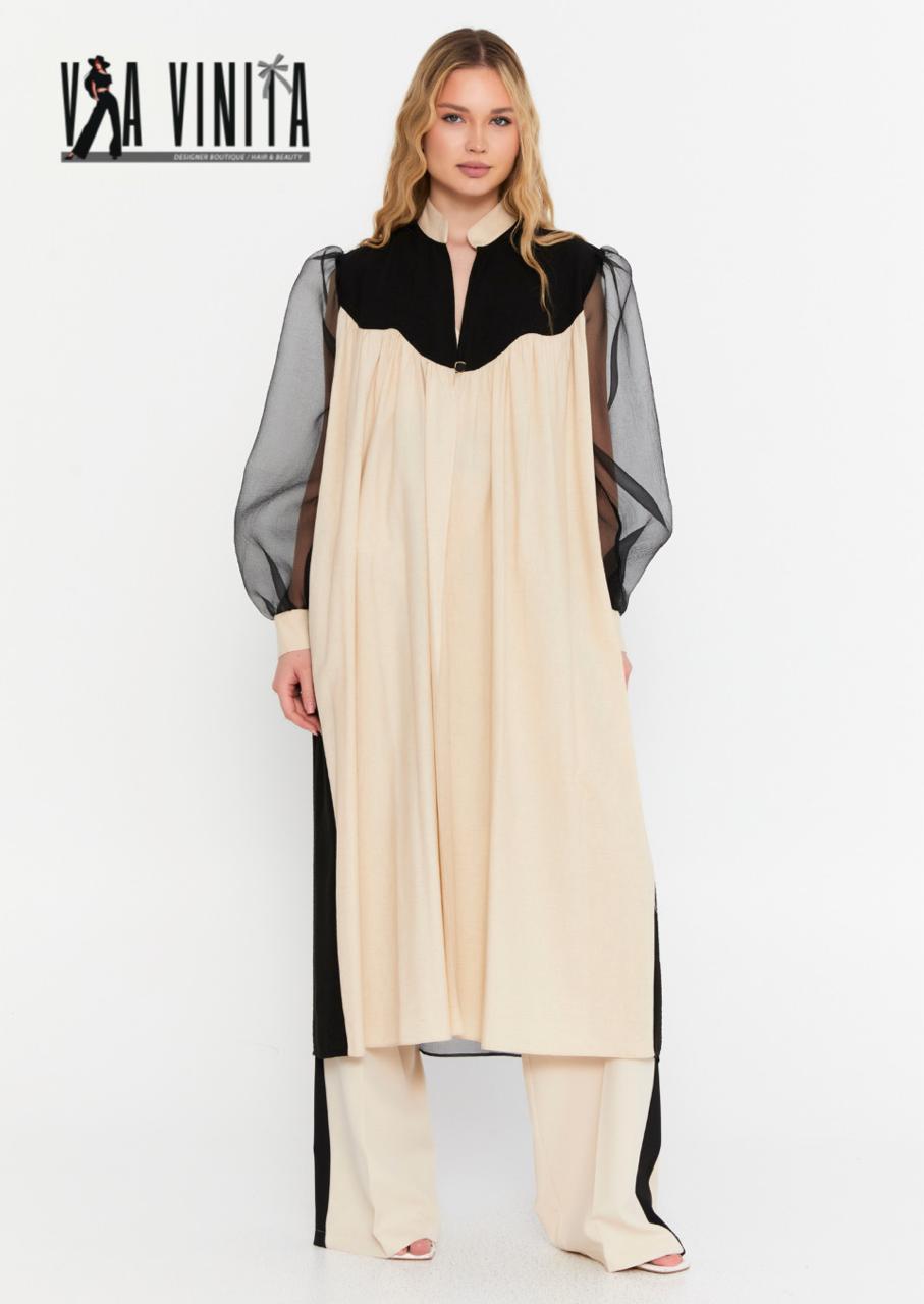 Sophisticated and modern, this flowing two-tone ensemble pairs a soft sand-toned tunic with sheer black bishop sleeves and a contrasting black yoke for a striking yet refined effect. The loose, draped silhouette offers effortless movement and comfort, while side slits add a contemporary edge. Styled with matching wide-leg trousers, this look is perfect for chic daytime events or elevated evening outings.