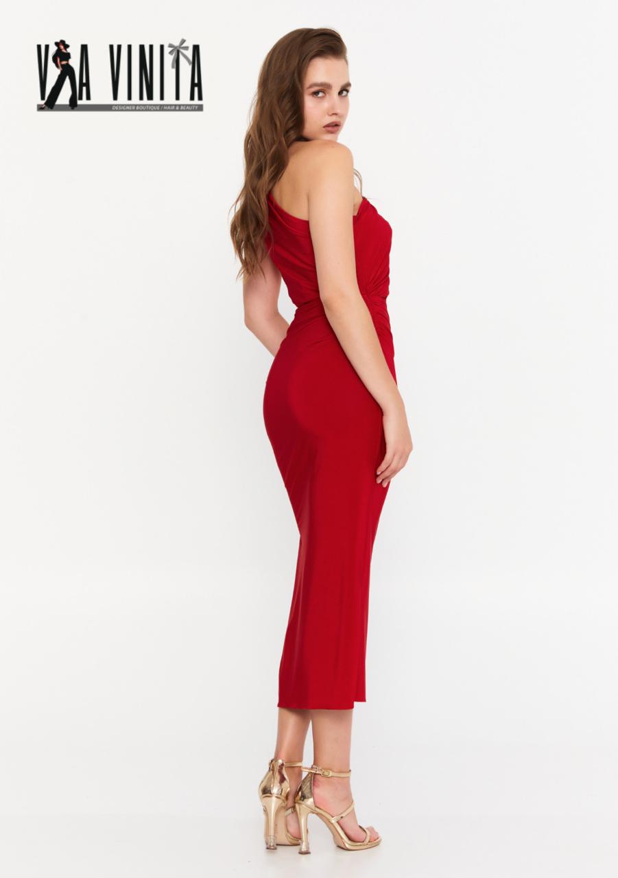This bold and beautiful scarlet red midi dress is designed to make a statement. The dress features a stylish one-shoulder design with a striking goldtone ring detail on the strap. A daring cutout at the waist adds a modern, fashion-forward touch. The ruched details on both the top and the skirt create a flattering, body-hugging silhouette, while the midi length keeps the look elegant. This dress is perfect for a cocktail party, a formal dinner, or a special night out.
