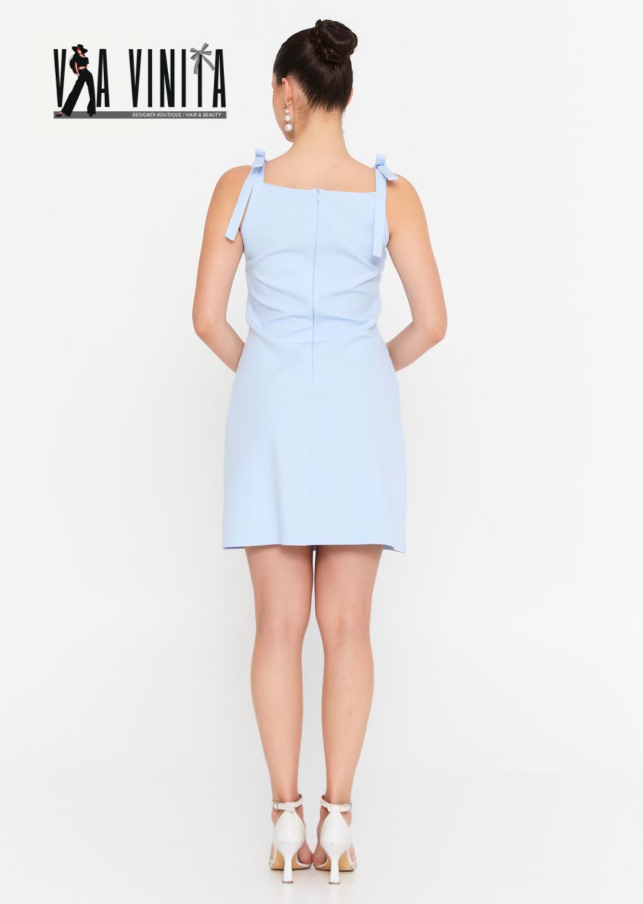 Simple, chic, and undeniably sweet, this sky blue mini dress is a must-have for your wardrobe. The dress features a clean, straight neckline and is held up by delicate straps with adorable bow details on the shoulders, adding a charming and feminine touch. Its A-line silhouette is both comfortable and flattering, making it a perfect choice for a sunny day out, a garden party, or a casual lunch. Pair it with simple heels or sandals to complete the look.